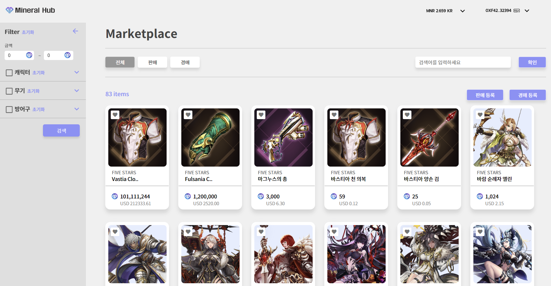 내년 초 파이브 스타즈의 글로벌 출시 이후 미네랄 HUB의 NFT 마켓에서 게임에서 얻은 무기나 캐틱터등을 NFT화 하여, 거래 할 수 있다고 합니다!
