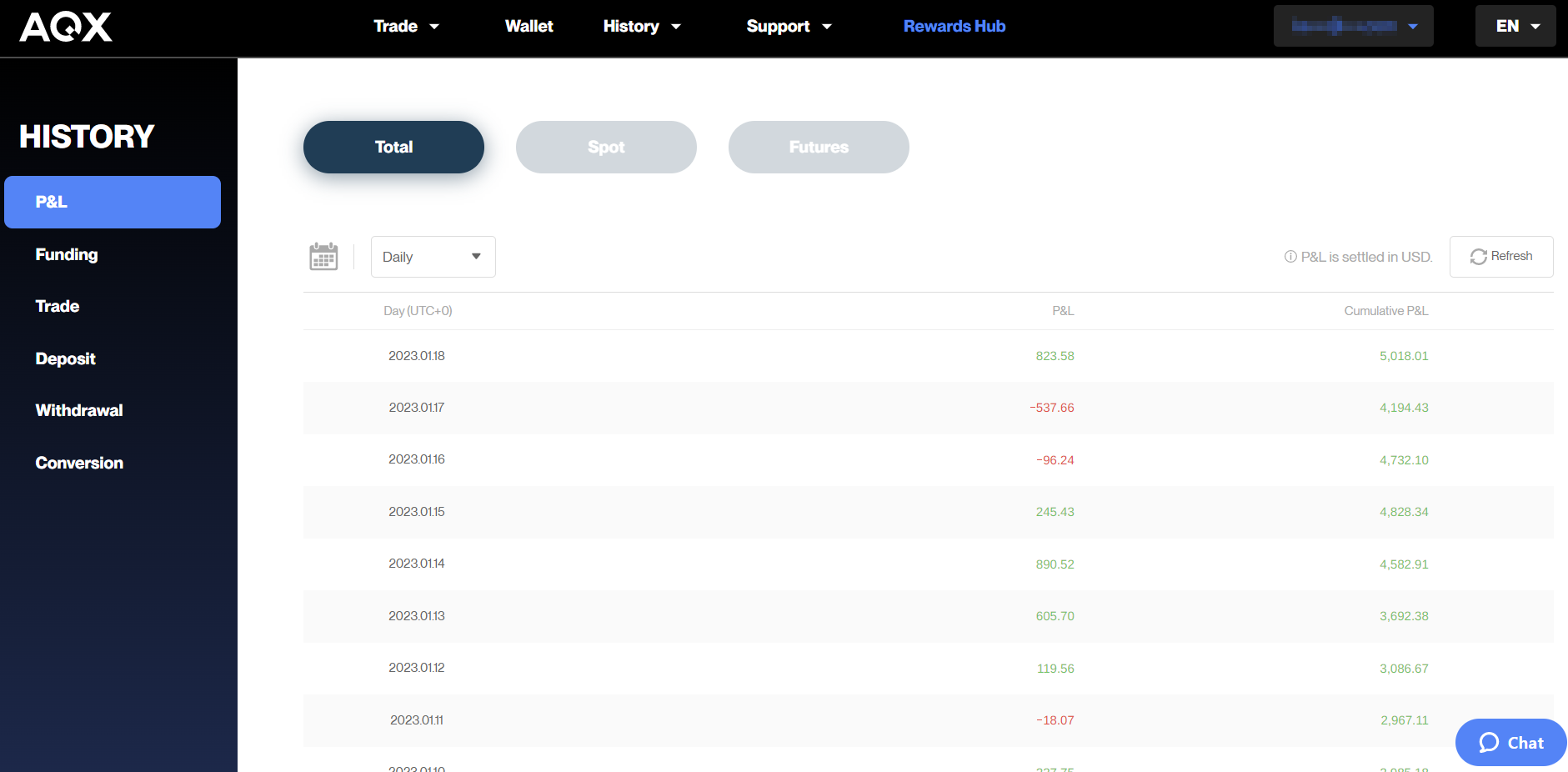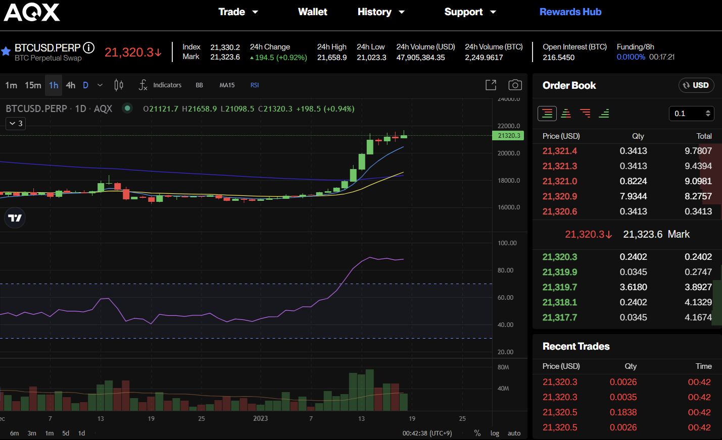 현재 AQX 거래소에서 23년 1월동안 약 5,000달러 상당의 수익을 달성하였으며, 리스크 관리를 해가며 천천히 적립식으로 비트를 모아갈 예정입니다. [거래 수수료 0%]